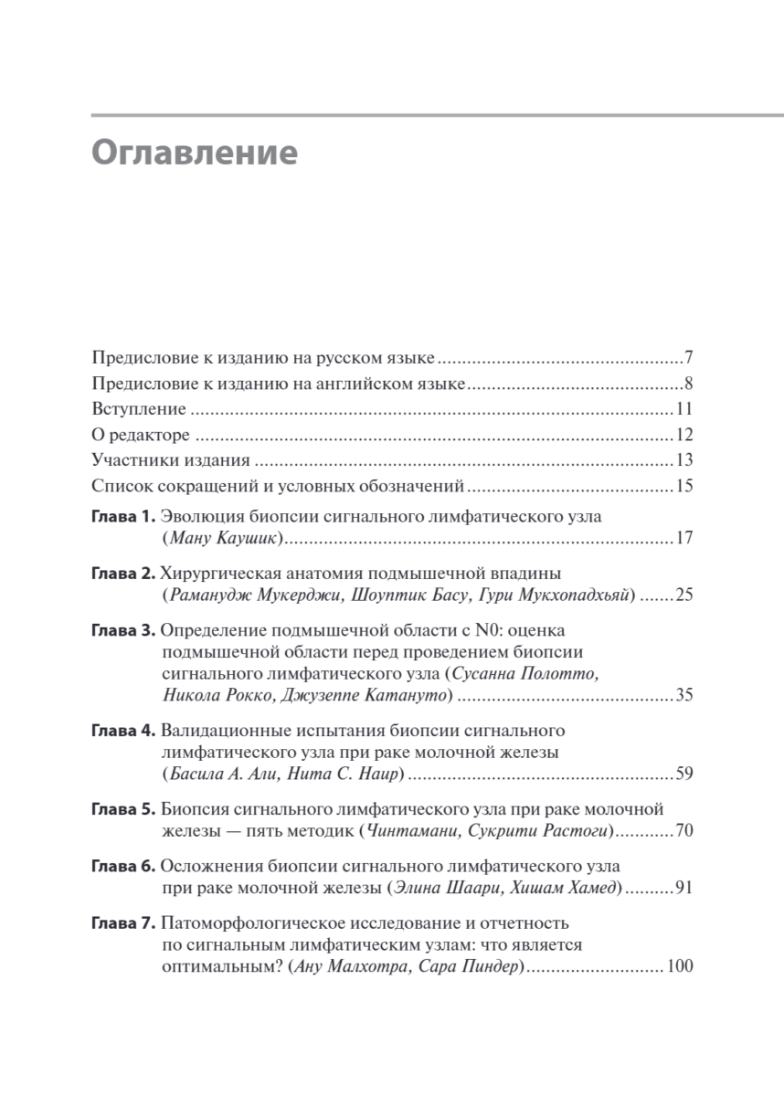 Приведены актуальный обзор всех значимых исследований, касающихся биопсии подмышечных узлов, детальный и практический подход к хирургической анатомии подмышечной впадины. Изложены краткие рекомендации и алгоритмический пошаговый подход к различным методикам, включая последние достижения. Даны объяснения ограничений и преимуществ каждого метода дозорной биопсии узлов при раке молочной железы, а также советы по их адаптации к конкретным пациенткам, медицинским центрам и хирургам. Издание предназначено врачам-онкологам, патоморфологам, хирургам и всем, кто интересуется данной областью.
